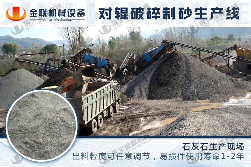 時(shí)產(chǎn)100噸對(duì)輥破碎機(jī)生產(chǎn)現(xiàn)場(chǎng)-石灰石破碎制砂